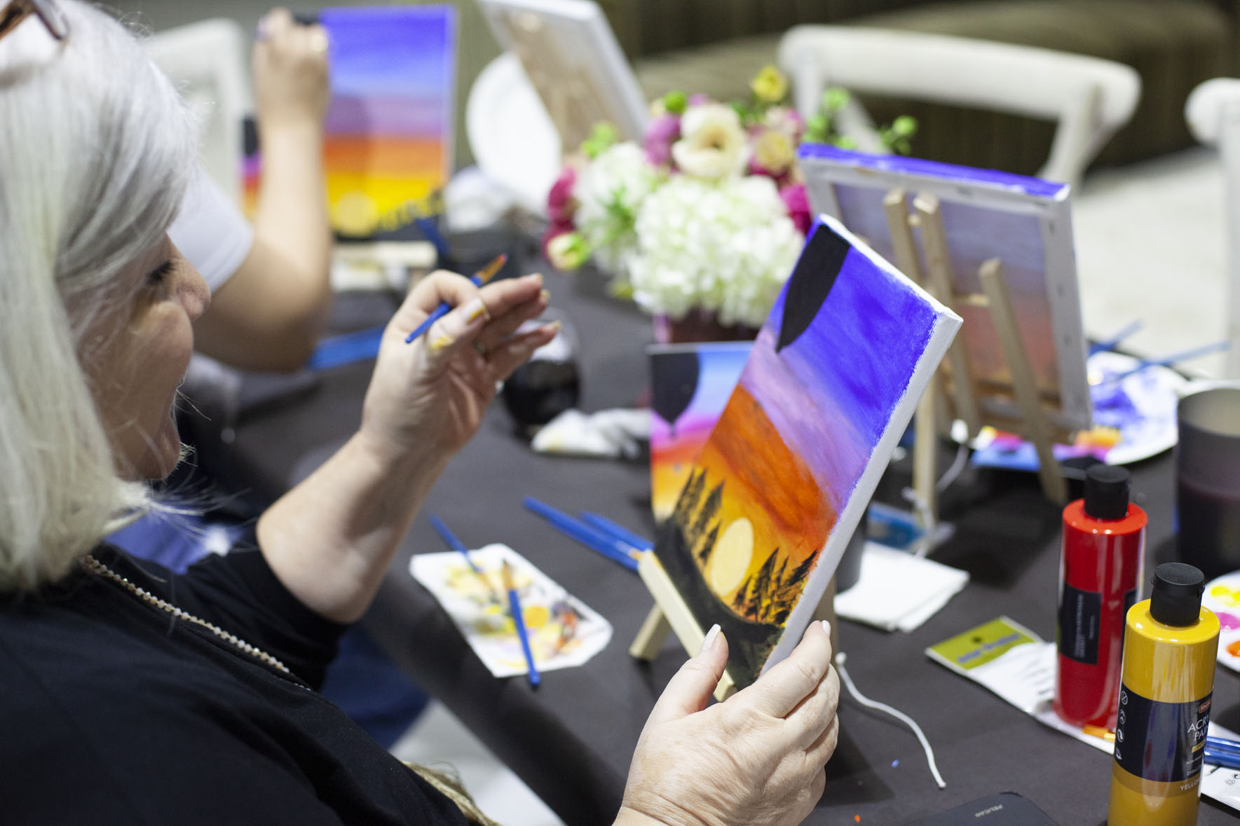 The tables, adorned with floral centerpieces, beckoned us to take a seat and unleash our inner artists. Whether you’re a seasoned painter or a novice, there’s something magical about putting brush to canvas, especially in the company of friends.